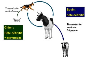 Dans la grande majorité des cas, les animaux se contaminent in utero. Une vache porteuse du parasite a 80 % de risques de transmettre Neospora caninum à son fœtus. Le veau naît sans signe particulier, mais il est infesté.