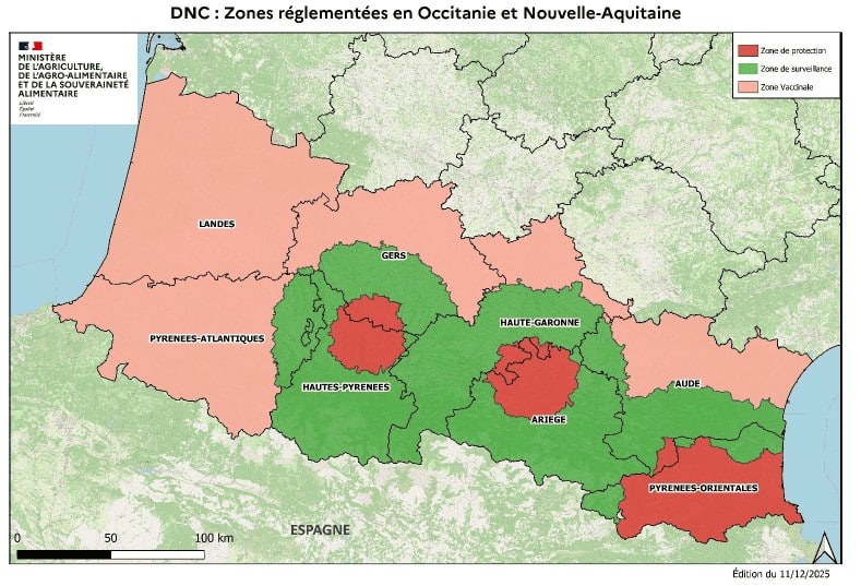 A compter de ce jour, la zone vaccinale DNC est étendue à l’ensemble des communes du Tarn (81) et de l’Hérault (34) qui ne sont pas déjà en zone de surveillance, en complément de celles des Landes (40), des Pyrénées-Atlantiques (64), du Gers (32), de la Haute-Garonne (31) et de l’Aude (11) qui sont déjà en zone vaccinale étendue.