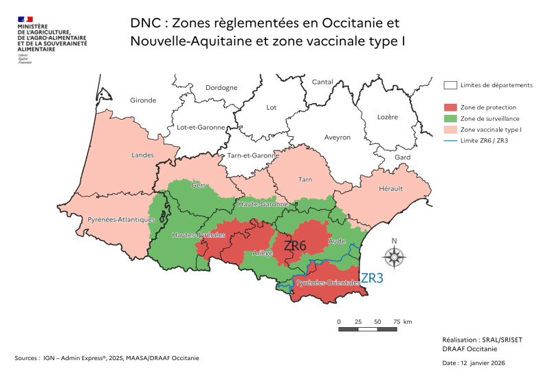 A compter de ce jour, la zone vaccinale DNC est étendue à l’ensemble des communes du Tarn (81) et de l’Hérault (34) qui ne sont pas déjà en zone de surveillance, en complément de celles des Landes (40), des Pyrénées-Atlantiques (64), du Gers (32), de la Haute-Garonne (31) et de l’Aude (11) qui sont déjà en zone vaccinale étendue.